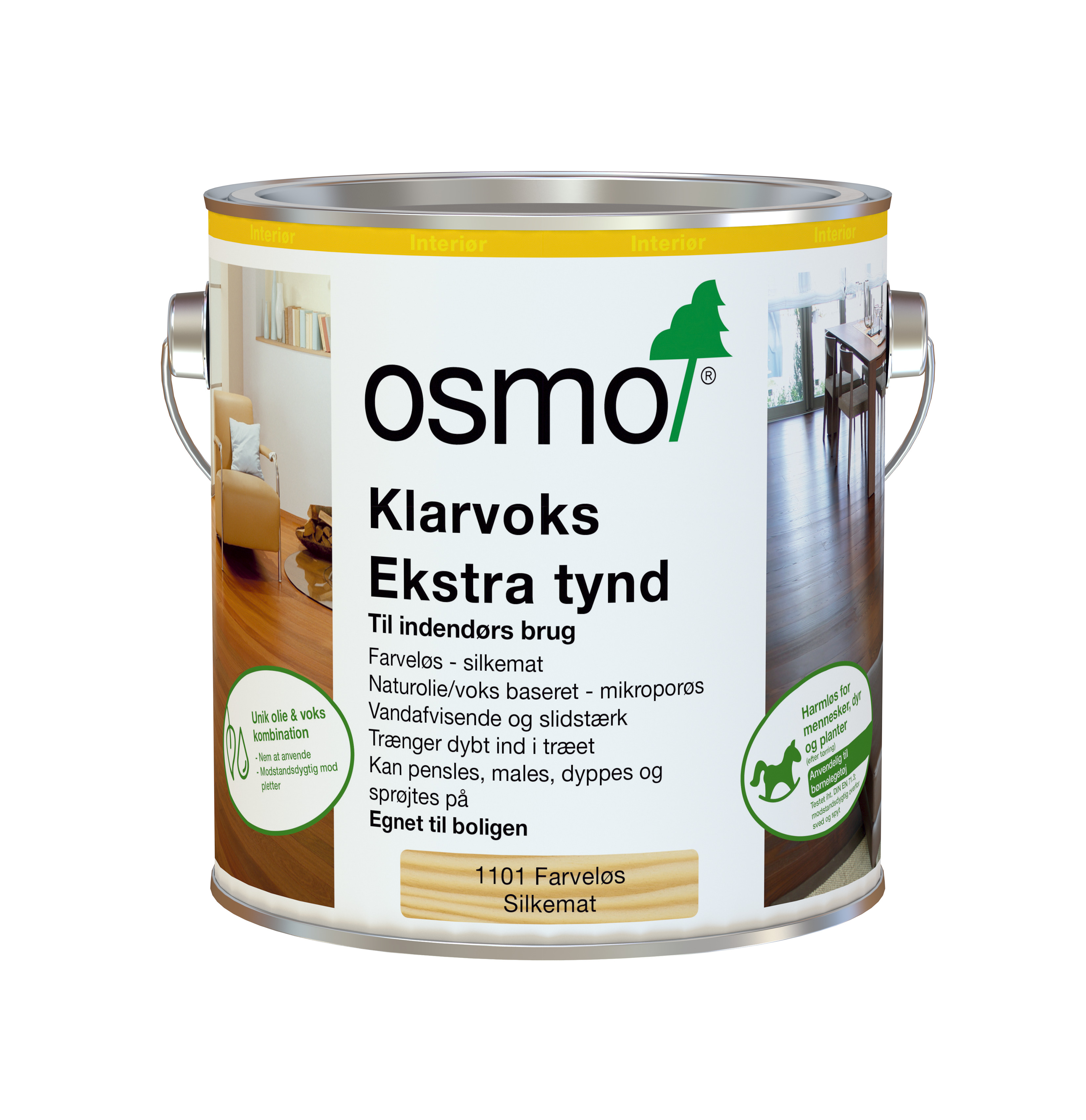 Osmo Klarvax er ekstra tynd i konsistensen, så den kan trænge dybt ind i træet og bevare dets naturlige karakter. Anvendes til behandling af eksotisk træ indendørs, f.eks. Mahogni, Wenge, Merbau, Jatoba (eller røget Eg og røget Ask) og passer til alle typer overflader som trægulve, møbler, paneler på vægge/lofter m.m. Også i køkkener, badeværelser og poolområder.