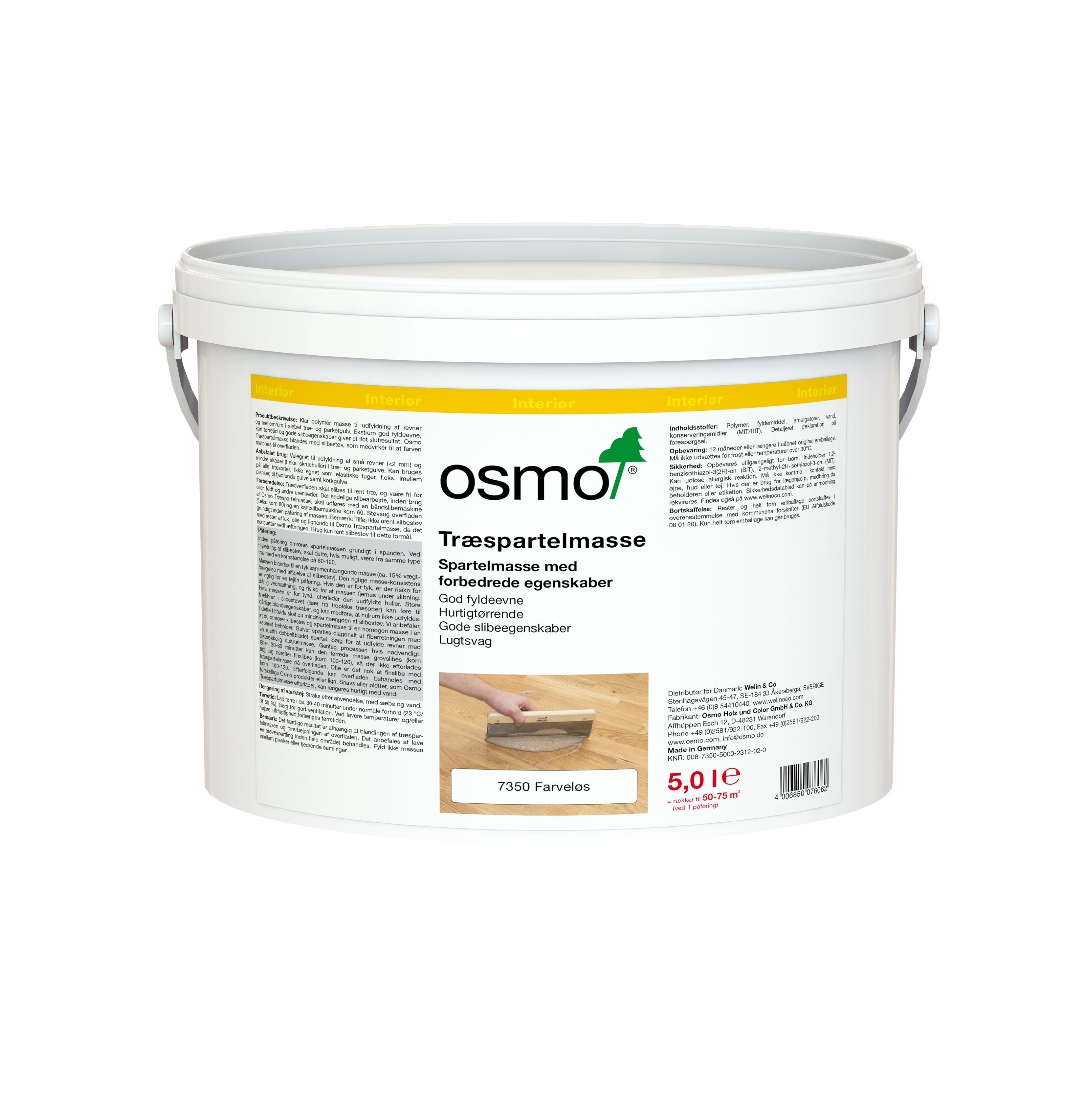 Osmo Spartelmasse er vandbaseret, har svag lugt og tørrer hurtigt. Den er nem at påføre med spartel af rustfrit stål og let at slibe.