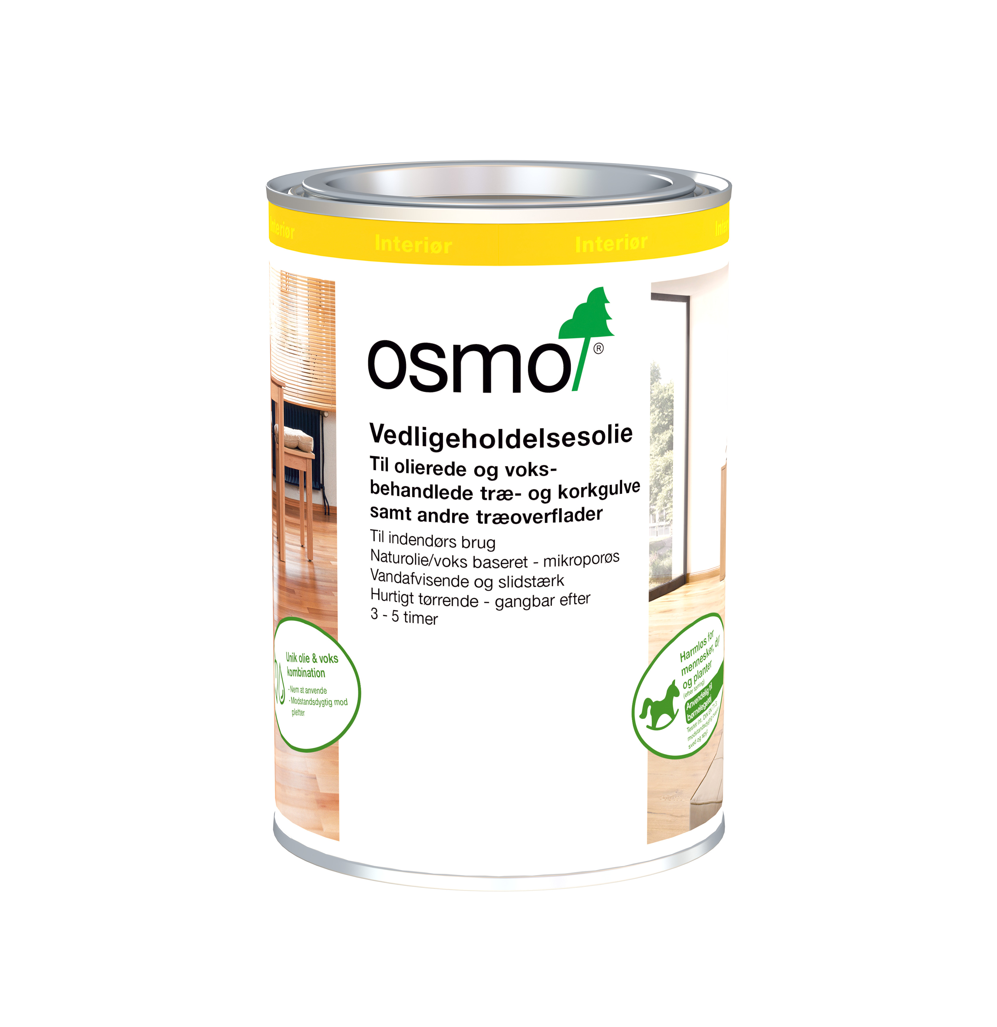 Regelmæssig brug af Osmo Vedligeholdelsesolie forhindrer tidskrævende og kostbar slibning/renovering. Hurtigttørrende, tør efter 3-4 timer.